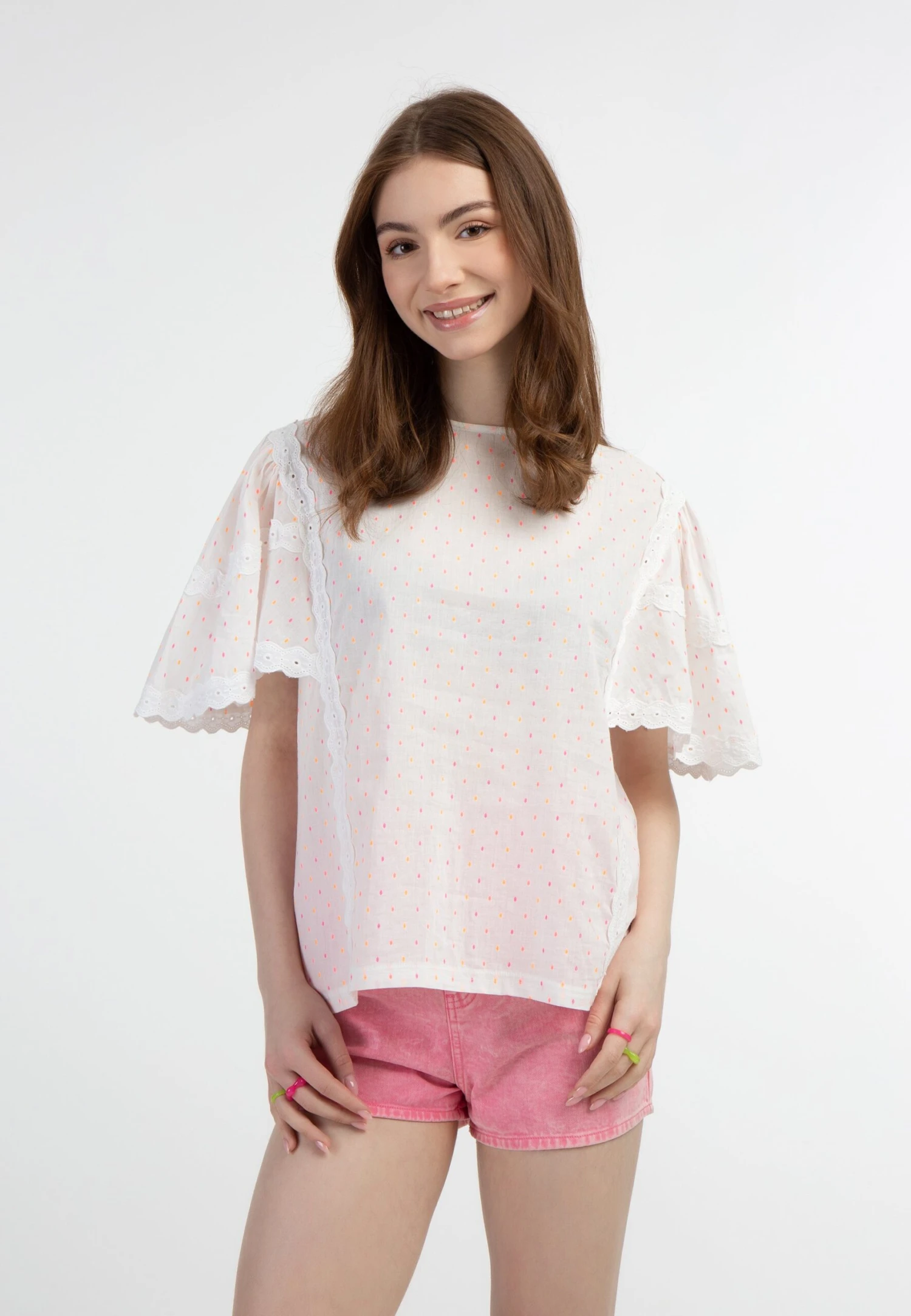 MyMO Blouse – Weiss Pinkorange Punkte